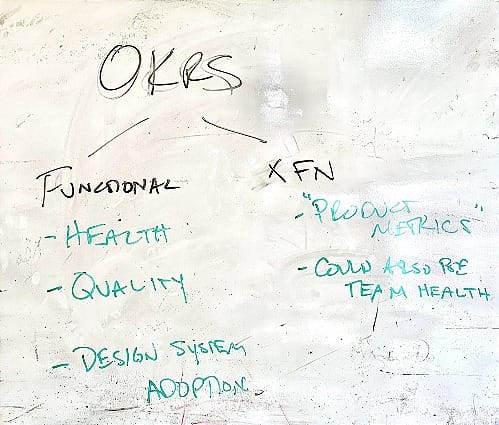 In the whiteboard photo above, I also identify "team health" as a cross-functional OKR, which is similar to how organizational health was definedโteam morale and engagement. A key add would be an internal pulse survey that asks (in part) about the experience of partnering with other functions. This is sometimes referred to as an internal NPS.