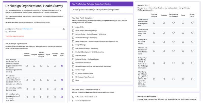 The survey took as a starting point Chapter 3 in Org Design for Design Orgs, The 12 Qualities of Effective Design Organizations. I then added questions that provided a fuller picture of how the organization is operating.