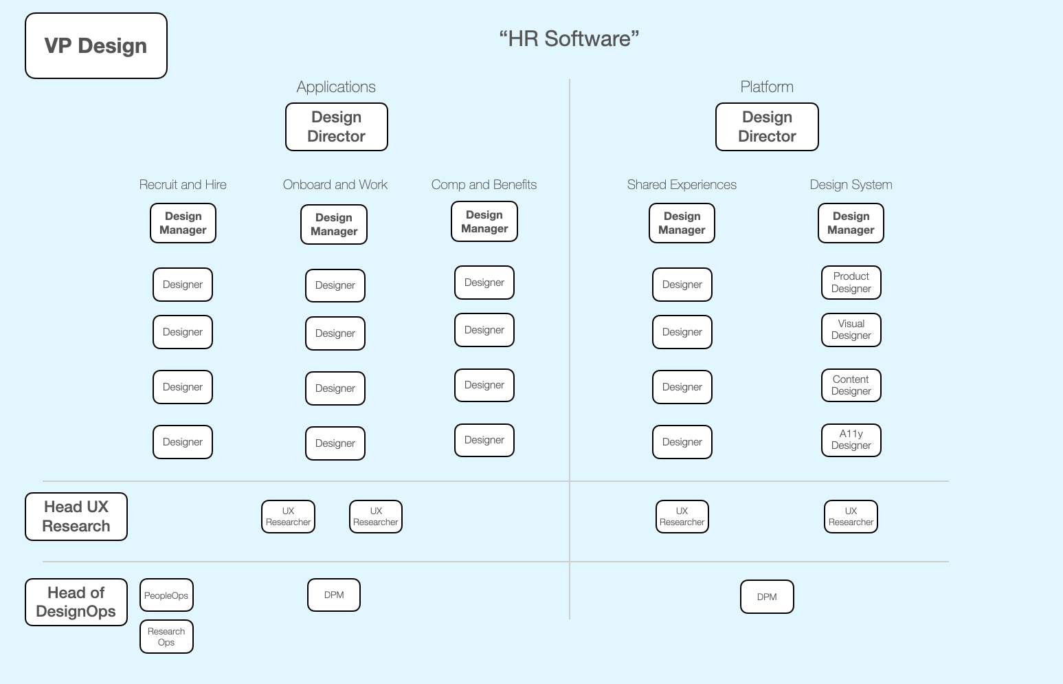 As design organizations scale, I've worked with a number of design leaders who struggle with all that's expected of them. Let's look at the "HR Software" org I drew in the last post.