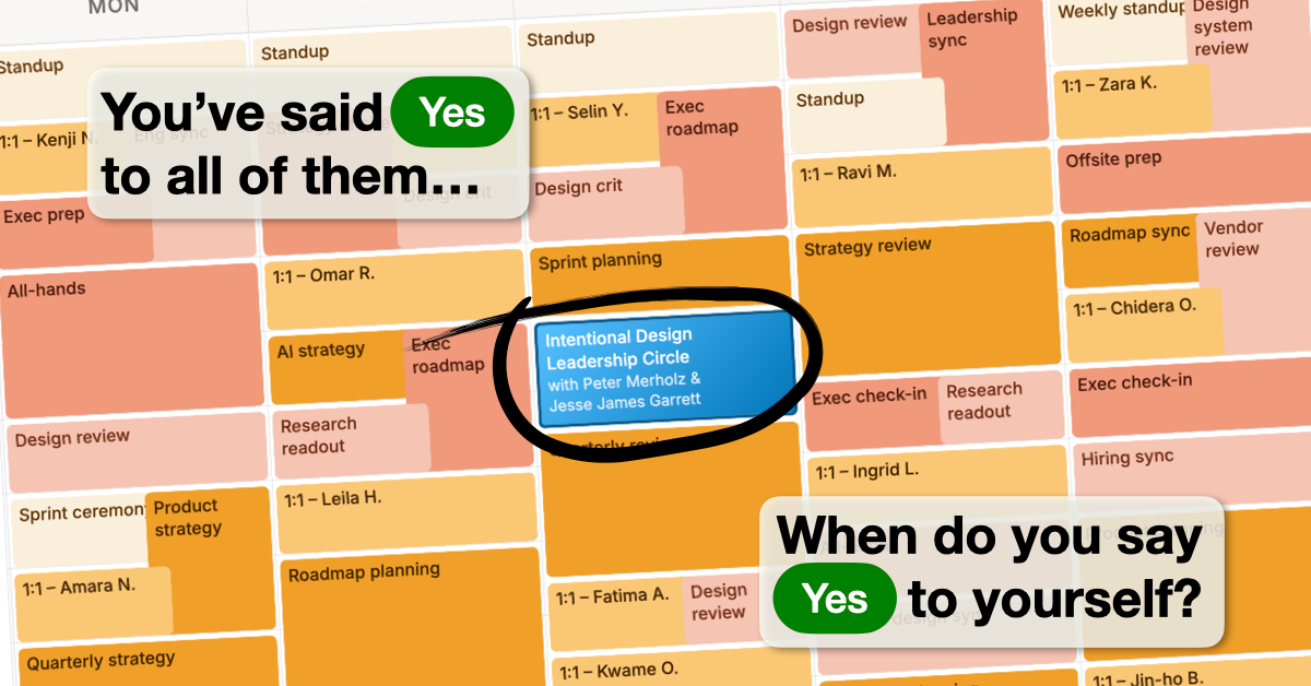 There are still a few seats at the table for the Intentional Design Leadership Circle, the 6-week cohort Jesse and I are facilitating for director-and-above design leaders. The idea is to escape reactivity and, within a space to reflect and connect, become intentional in your leadership work.