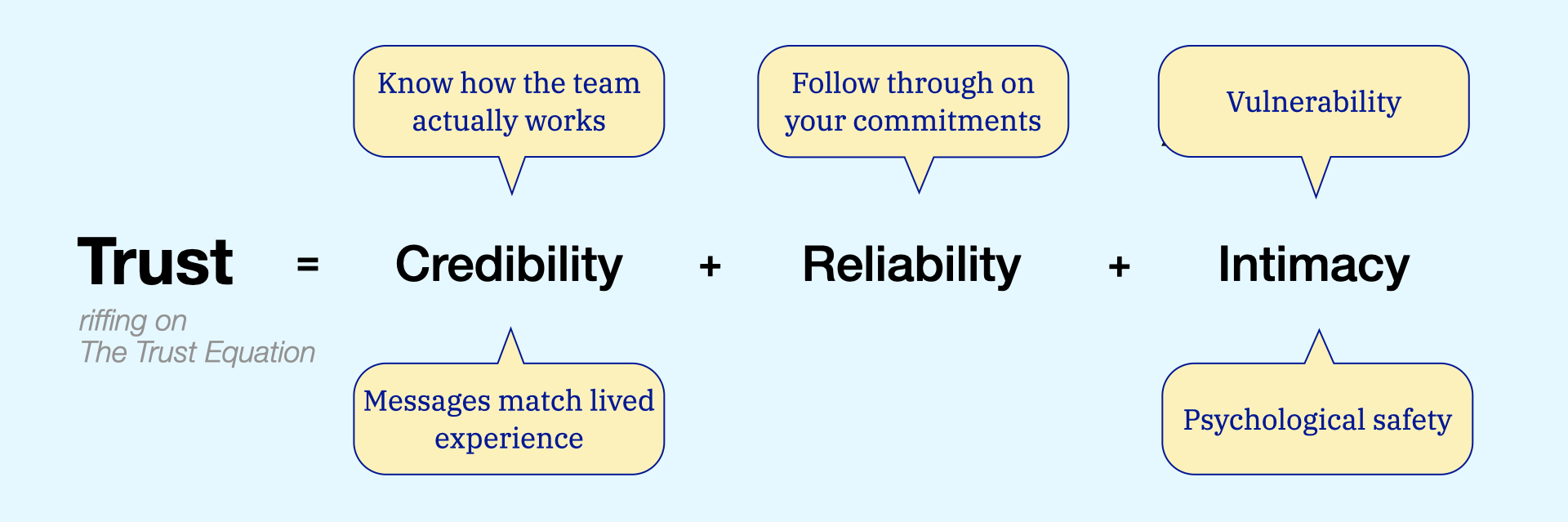 In my leadership development practice, I build on The Trust Equation, tailoring it to UX/Design teams (the word balloons):