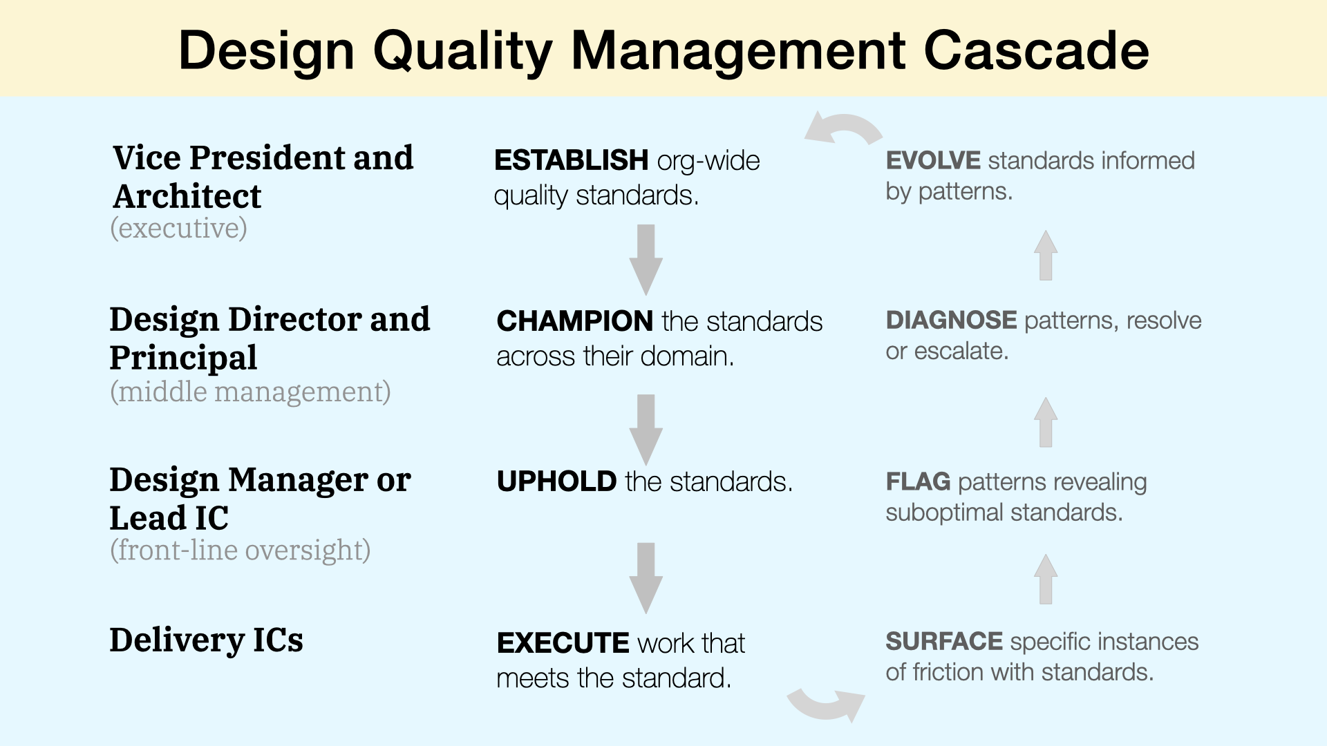 As I expanded my thinking, I significantly reworked last week's Design Management Quality Cascade, incorporating Delivery ICs, and better distinguishing responsibilities across levels. A teaser: