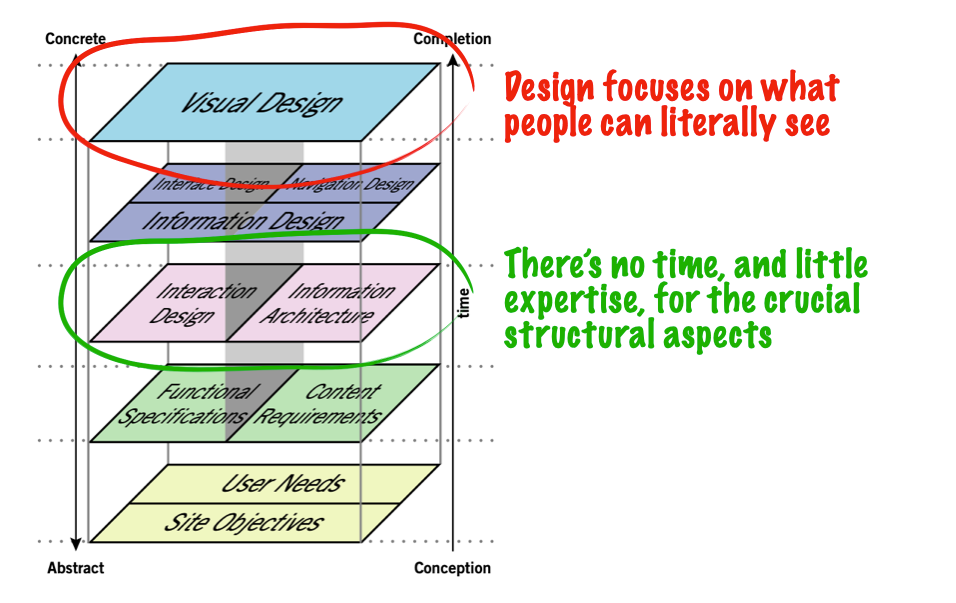 But these designers were often staffed as individuals (partnered with a product manager and some number of engineers), with a focus on the visual UI of the product—screens. The greatest sin a designer could commit was to keep engineers waiting, so they relied on default practices that produced good enough material quickly enough to keep the engineers busy. Concern for the true complexity of software was ignored, which meant deeper practices in interaction design and information architecture became marginalized.