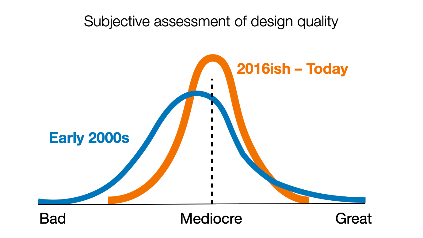 There are many reasons for this compression in quality, including the standardization and even professionalization of practice and the adoption of frameworks and tools (design systems) that ensure interface consistency. Lenny Laurier goes into deeper detail about these specifics in his essay "Good enough, isn't" (though I think he's too generous in his quality assessment).