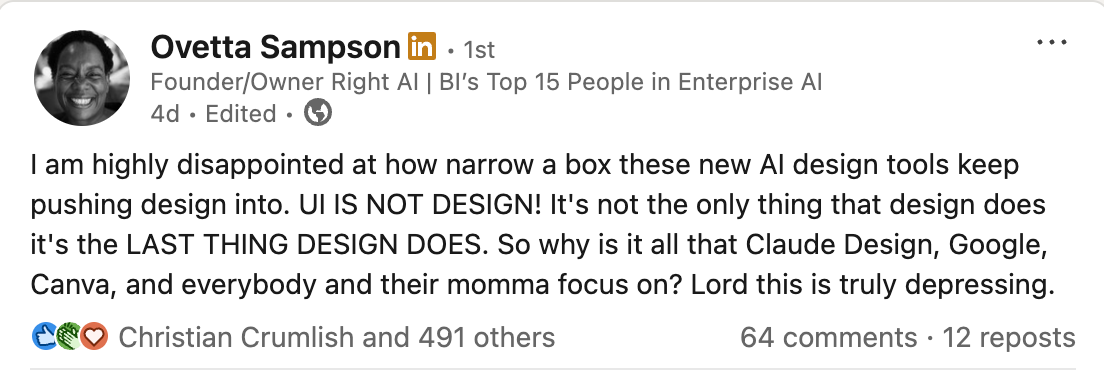 Starting with the layoff wave following pandemic-era overhiring, and now in the AI Moment with its concomitant discombobulation, the perceived threat to design is largely due to this constriction of the work to the production of screens. Ovetta Sampson's frustration is mine as well: