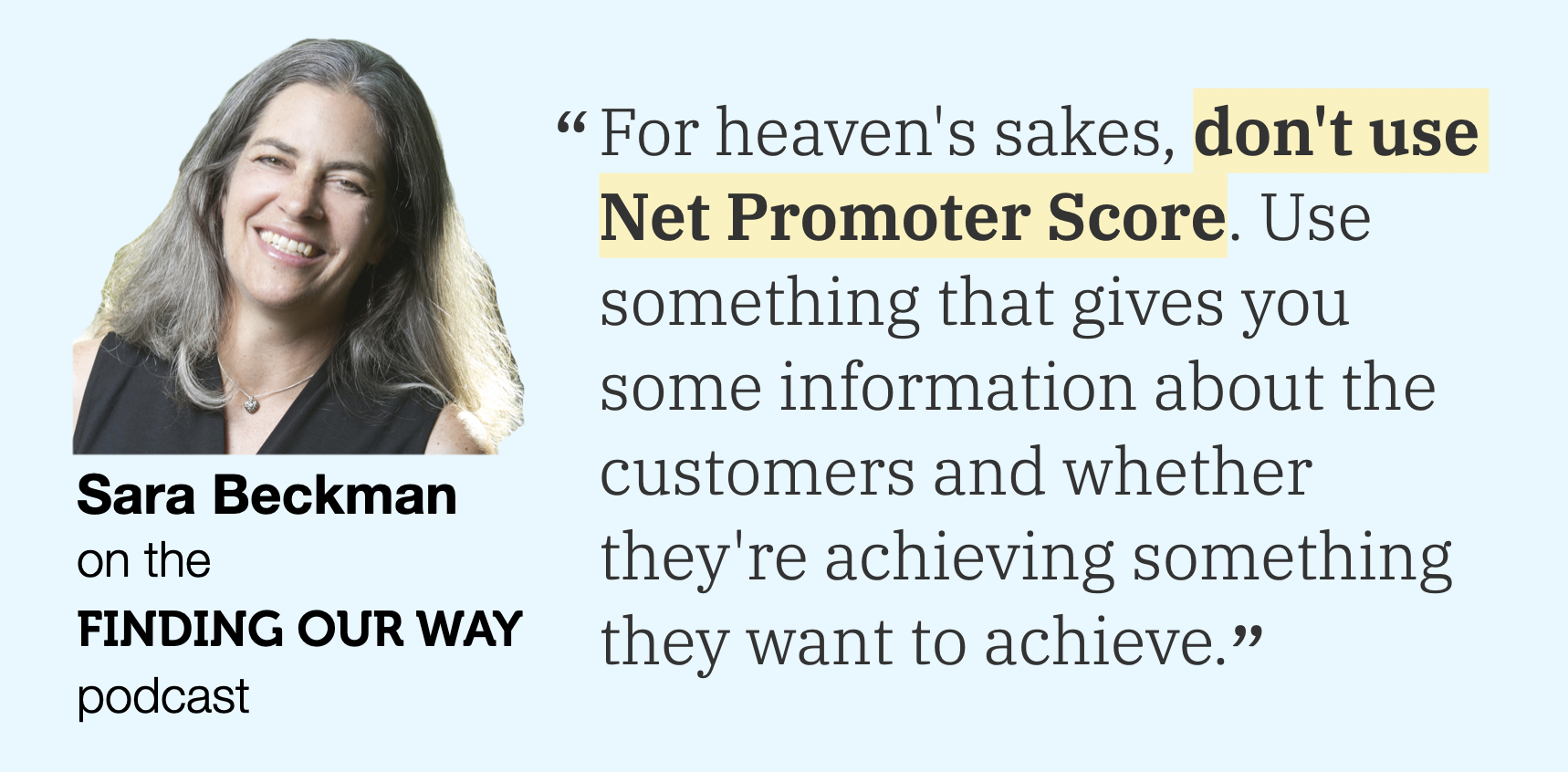 In the most recent Finding Our Way, Sara Beckman delivers a lot of wisdom about metrics, in particular how to identify helpful proxy metrics. For a LinkedIn post, I quoted her commentary about Net Promoter Score (NPS):