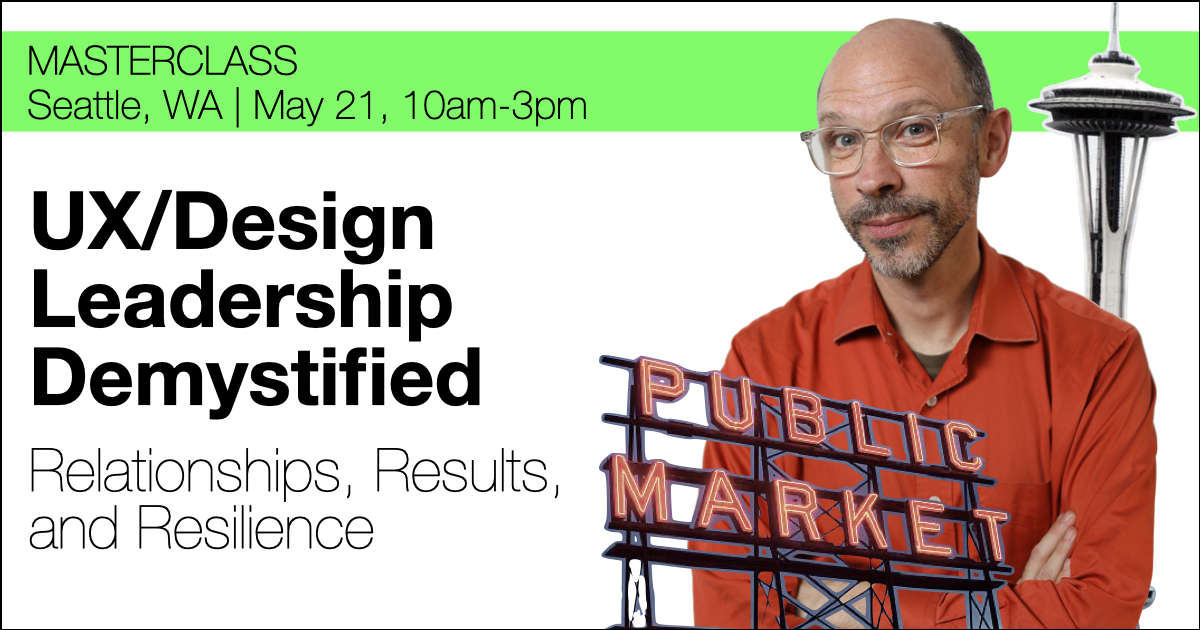 And now for a little self-promotion: I'm bringing my Design Leadership Demystified masterclass to the Emerald City (Seattle) on May 21, hosted by the good people of Blink UX. Please pass the word along to anyone you know who may be interested! Attendees always come away with a brain full of new ideas, and make new connections, too!